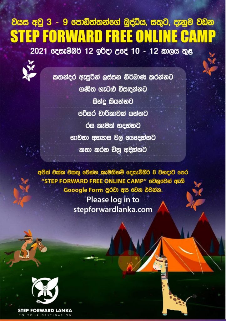 STEP FORWARD FREE ONLINE CAMP November 20, 2021 by admin Previous articleFamily sessionsNext article STEP FORWARD LANKA Free Online Camp Leave a Reply Cancel replyYour email address will not be published. Required fields are marked *Comment * Name * Email * Website Save my name, email, and website in this browser for the next time I comment.