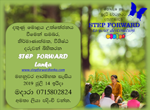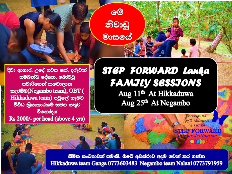 STEP FORWARD OutPro අද ලංකාවේ බොහෝ දරුවන්ගේ තත්ත්වය ඉතාමත්ම අයහපත් මට්ටමක පවතින්නේ…ඒ බව වැඩියෙන්ම දන්නෙ 24 වසරක් පුරා උපදේශනය සඳහා නිතරම දරුවන් අප වෙත රැගෙන එන නිසයි. පාසල් අධ්යාපනයට පමණක් සීමා වූ දරුවන් නිසා අසමබර පෞරුෂයන්, කෝපවීම, කලහකාරී හැසිරීම්, ඉදිරිපත් වීම අඩුවීම, ගැටලු විසඳාගැනීමට නොදන්නාකම නිතර ඇතිවෙන ප්රශ්න බව ජනමාධ්යයෙන් ඔබ දකිනවා ඇති. මේවන විට D විටමින් අඩුකමින්ද දරුවන් පීඩා විදී. සැබැවින්ම සාර්ථක, බුද්ධිමත්, සමබර දරුවෙක් ඔබට අවශ්ය නම් එළිමහන් කණ්ඩායම් ක්රියා සහ භාවනා අභ්යාස ඇතුලත් මෙවැනි වැඩසටහන් වල අවශ්යතාව අතිමහත් බව ඔබ තේරුම් ගත යුතුයි. 🌷තමන්ට ආස දේ තමන්ට ඕන විදිහට කරන්න පුළුවන් දවසක්…. 🌷හිර වුණු පන්ති කාමරයෙන් මිදිලා…අලවන්න, කපන්න, නටන්න, ගයන්න විතරක් නෙමෙයි තමන්ගේම නිර්මාණාත්මක හැකියාව පිටතට යොමු කරන්න හැකි හැකි වුණු දවසක්…. දෙමව්පියන් හිතාගෙන ඉන්නේ දරුවන් පාසලටත් අමතර පන්තිවලටත් යවලා උගන්වන දේවල් වලින් විතරක් මුළු ජීවිතයම ජය ගන්න එයාලට පුළුවන් කියලා….ඒක කවදාවත් කරන්න බෑ දරුවාගේ මොළයේ එක කොටසක් විතරයි ඒ විදිහට වර්ධනය වෙන්නේ…ඉතිරි සියල්ල දරුවන් ලබන්නේ එයා…