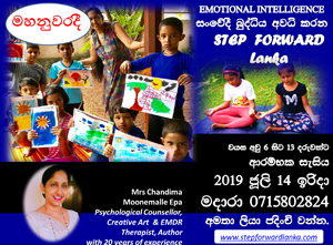 STEP FORWARD LANKA දැයේ දරුවන් නායකත්වය කරා රැගෙන යන සුන්දර තෝතැන්න…. 2023 සෑම මසකම මුලදී දරුවන් බදවා ගැනේ…. පොත පතින් අධ්යාපනයෙන් පමණක් මනා පෞරුෂත්වයකින් හෙබි නායකයින් බිහි නොවෙයි. ඒ සඳහා නිවැරදි මග මඟ පෙන්වීමක්, මනා මෙහෙයවීමක් අවශ්ය වෙයි. ඔබට අවශ්ය පොතේ දැනුම පමණක් ලැබූ උගතෙක් ද, නිර්මාණශීලී සැබෑ බුද්ධිමතෙක්ද කියා දෙමාපියන් වශයෙන් ඔබ තීරණය කළ යුතු වෙයි. අද පවතින අධ්යාපන රටාවෙන් බිහිවන උගතුන් කරුණාව, දයාව, මනුෂ්යත්වය හදුනන සැබෑ බුද්ධිමතුන් ද යන ගැටලුව පවතියි. දරුවන්ට දරා ගත නොහැකි විෂය නිර්දේශය නිසා ඔවුන් මහත් සේ පීඩනයට පත්ව සිටින බව වසර 25ක මනෝවිද්යා උපදේශන කටයුතු නිසා අප දනිමු. අද ලෝකයට අවශ්ය නිර්මාණශීලී බුද්ධිය( Creative thinking ), චිත්තවේගී බුද්ධිය ( Emotional Intelligence ) වර්ධනය කරන අපගේ STEP FORWARD ක්රියාකාරකම් නිසා දරුවන් සතුටින් ඉගෙන ගන්නා අය බවට පත්වෙයි. අපේ අරමුණ දරුවාගේ කුසලතා හඳුනා ගනිමින්, ඔහු/ ඇය සාර්ථකත්වය සොයා යායුතු මාර්ගය පෙන්වා දී, එහි උපරිමය දක්වා දරුවා මෙහෙයවීමයි. මේ සඳහා කෙරෙන සිත එකඟ කර ගැනීමේ අභ්යාස…
