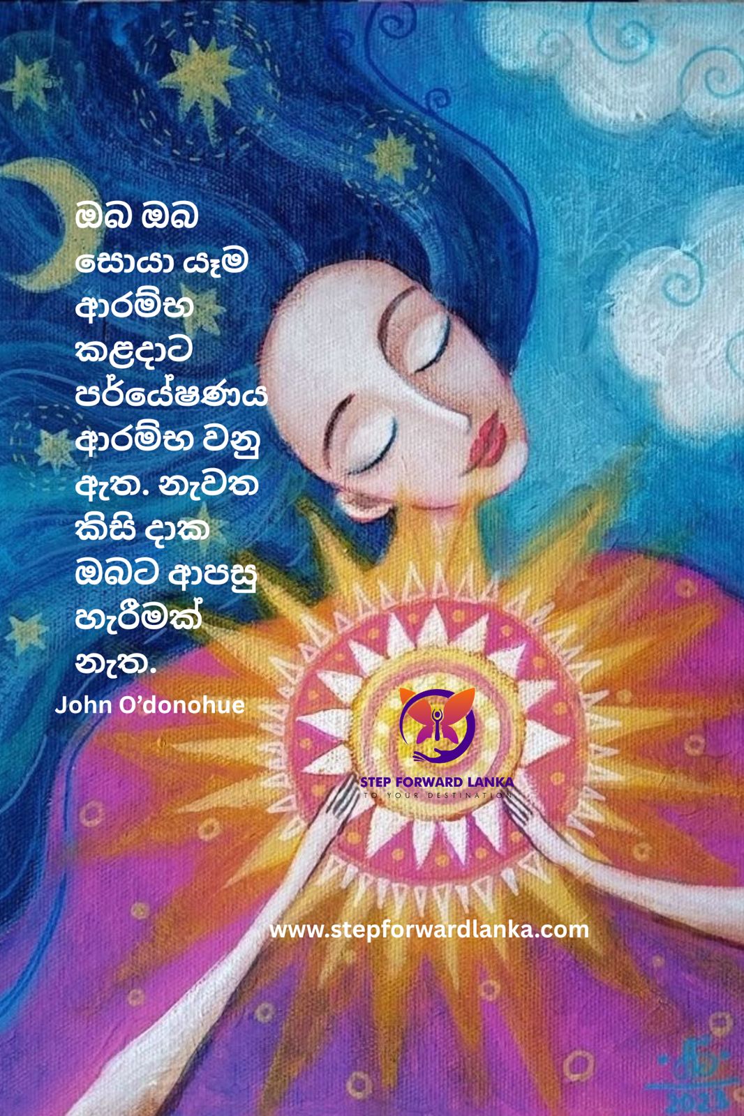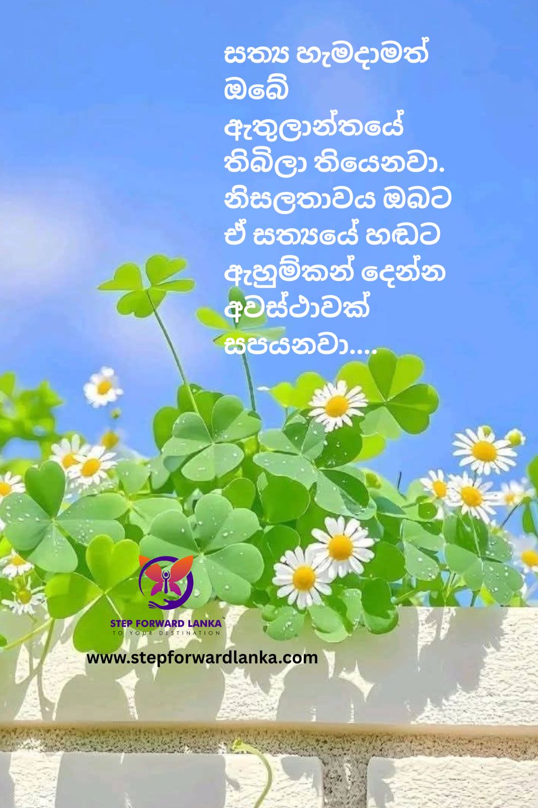 STEP FORWARD Daily Promise අද අපි බලමු අපට ඉන්න, අපිව ගැඹුරින්ම දන්න, හොඳම කෙනා හොයාගන්න. මේ තත්පර කීපයක වැඩක්. දිනපතා වරින්වර පුහුණු වෙන්න. 🐬ඔබේ ඇස් වසා ගන්න, හුස්මක් ගන්න, ඔබ කරන ඕනෑම දෙයක්( යන්ත්ර ආශ්රිත වැඩ, රිය පැදවීම් වැනි දේ හැර) තත්පර දහයක් නවත්වා නිහඬතාවය සොයා ගන්න. නිහඬතාවයට පිවිසෙන්න…. 🐬මේ හිත හැම වෙලාවෙම කොහෙදෝ දුවනවා. මොනවදෝ කියවනවා…ඇහුනද ඔබට? ඉතිං ඔය කියවන සේරම ඇත්තද? හොඳට සිහියෙන් බලන්න. අහන්න. දෙගිඩියාවක් දැනෙනවා නම් පොඩ්ඩක් තව පැති වලින් බලන්න. නිහඬතාවය තියෙන්නෙ ඔය යන දෙබසට යටින්. 🐬ඔබ කොහේ සිටියත්, කොහේ ගියත්, ඔබට සමීපව “ඔබේම ඇතුලාන්තය” ඔබ සමඟ හැමවිටම ඉන්න හොඳම මිතුරා බව ඔබ දන්නවද? 🐬ඔබ ඔබේම සිතුවිලිවල ගොදුරක් බවට පත්වෙලාද? ඔබව වට කරන් විටින්විට අරක හරි, මෙහෙමයි වෙන්න ඇත්තේ, මේක හරි….ඔබේම හිත ඔය වගේ බොහෝ දේවල් කියවද්දි ඔබට දරාගන්න අමාරු බව ඇත්ත! 🐬පොඩ්ඩක් දුරස් වෙන්න. වෙන කෙනෙක් වගේ ඈතින් ඉඳන් ඔබේ හිත දිහා බලන්න. මඩ වලක් වගේ කැලතිලා කියලා දැනෙනවා නම් ටිකක් තැන්පත් වෙන්න ඉඩ…