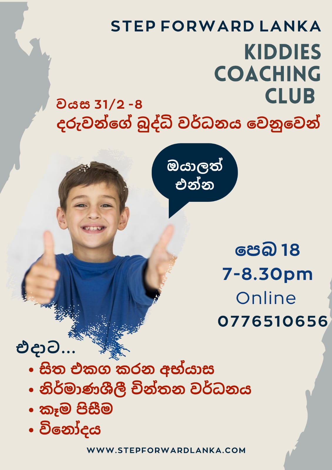 පෙබරවාරි මාසයට STEP FORWARD LANKA Kiddies Coaching Club ( KCC වයස 3 1/2 – 8 ) සහ Masters Coaching Club ( MCC වයස 9-17 ) සඳහා මේ දිනවල දරුවන් බඳවා ගන්නවා. නූතන ලෝකයට අවශ්ය 🌺 චිත්තවේගී බුද්ධි වර්ධනය සහ 🌺නිර්මාණාත්මක හැකියා වර්ධනයට අවශ්ය බොහෝ ක්රියාකාරකම් අපි දරුවන්ට කියා දෙනවා. ඒ ඒ වයස් කාණ්ඩවල දරුවන්ට ක්රියාකාරකම් කෙරෙන්නේ වෙන වෙනම කණ්ඩායම් විදියටයි. දරුවන්ගේ දකුණු මොළයේ වර්ධනය වැඩි දියුණු කිරීමෙන් ඔවුන්ගේ 🌺සතුට වර්ධනය වෙනවා. ඒ වගේම 🌺තීරණ ගැනීමේ හැකියාව,🌺ජීවිතය සමබර කර ගැනීම , 🌺සිත එකඟ කිරීමේ හැකියාව, මේ නිසාම 🌺ඉගෙනීම් කටයුතුවල වර්ධනය පැහැදිලිව දැක ගන්න පුළුවන්. වැඩි විස්තර : https://www.facebook.com/groups/400541487237199/permalink/1387750985182906/?mibextid=Nif5oz ජනවාරි Kiddies Coaching Club වැඩසටහනේ SF Kitchen time https://www.facebook.com/groups/400541487237199/permalink/1391267658164572/?mibextid=Nif5oz